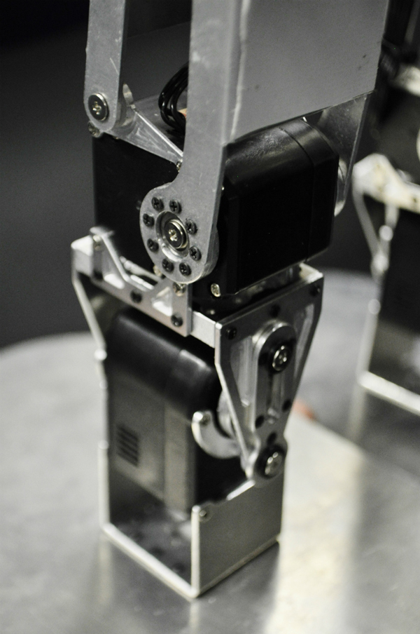 脚部ピッチ軸間は平行リンク機構を用いた。歩行時、常に左右の足裏が平行に動作するように設計をした。これにより市販の二足歩行ロボットによくある膝サーボモータの遅れによる不安定さが解消され歩行モーションの制作が簡易化できる。また、コスト面からも高価なハイトルクサーボモータが2個削減できるメリットがある。