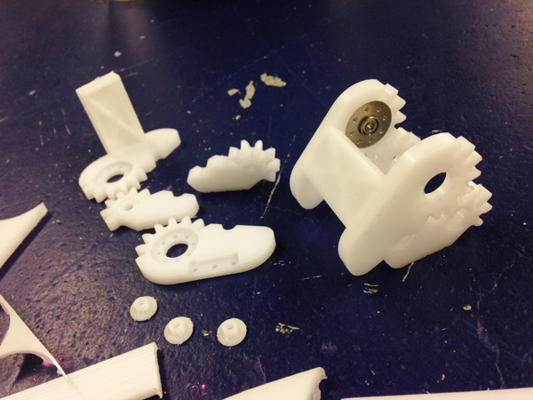 手の開閉には歯車を用い一つのサーボモータで動作するように設計した。歯車はフレームと一体化した設計となっており、指の開閉角度は設計時にギヤ比を変更することで任意の動作が可能である。