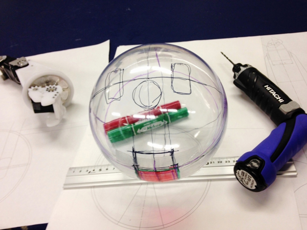 頭部はアクリル球を加工し製作した。頭頂部にはスピーカを搭載した。
