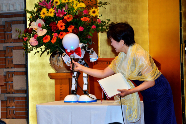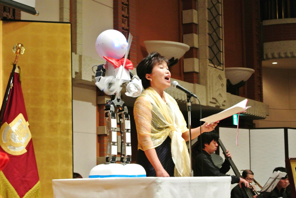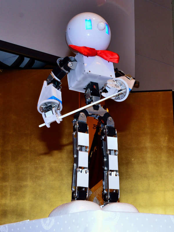 大阪工業技術専門学校120周年記念祝賀会にあわせて製作した指揮者ロボット「フクマス」(愛称:ふくちゃん)です。祝賀会ではジャズオーケストラの指揮をさせていただきました。