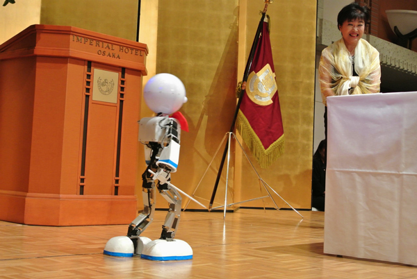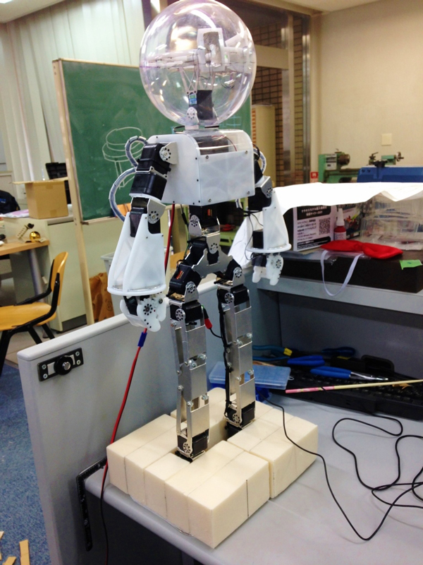 しかし、膝を曲げない歩行はできたが、満足のいく安定した物には製作できなっかた。本番では、これまでの二足歩行ロボットと同じ腰ロール軸を使わない膝を曲げた歩行を制作すること解決した。写真は祝賀会本番でフクマスが壇上を歩く様子である。