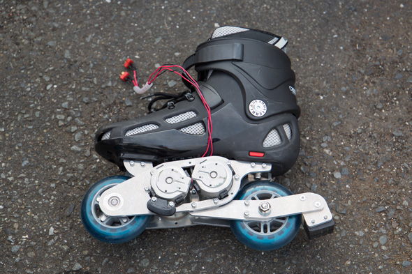モータをインラインスケートにつけてみました。 腰のコントローラで操作します。片足にDCモータを2個つけ、両足で4個ついています。 フレームはt=5のA5052です。