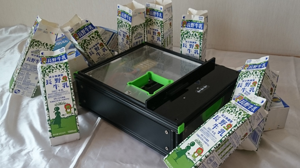 日々たまる一方の牛乳パックを何とかしたいと思い、放り込めば、牛乳パックの「ひらき」が出てくるような装置を妄想しつつ。できたのはこのレベルでした。