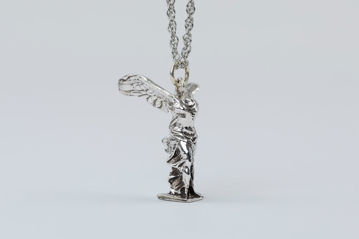 サモトラケ島のニケ像のシルバーペンダントです。3D-COATというボクセルモデリングソフトで原型を調整し、羽根部を分割してstlにて出力。外部にフレームを配置して本体は4面切削加工。羽根部は両面切削加工を行い、接着して原型を仕上げています。シリコーンゴムで複製型を作り、インジェクションワックス複製を行ってワックスに置換したのちに、石膏を流し込んで石膏型を作成。石膏型を電気炉で焼くことで鋳型を作成し、溶かした銀を流し込むことで銀に置換した後研磨して、チェーンを通す丸カンをロウ付けして仕上げています。