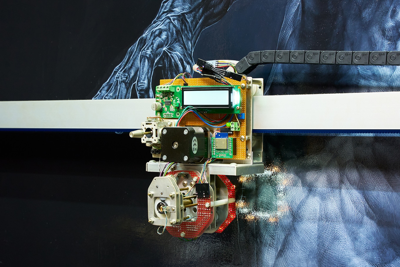 - マシンの先端についたケガキ針でキャンバス上に溝を掘る。