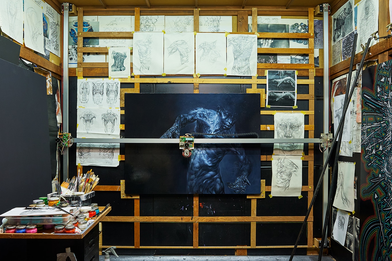 近年、コンピュータや機械は驚くほどの速さで進歩し、あたかも昔からそれらが存在していたと錯覚してしまうほどの自然さで身の回りに浸透している。一方、人間に一番近い自然である人体は多くの部品で構成されており複雑な機械のようにも見える。この制作においては、人体と機械を同じ水準で見ることができないかと考え、それらを境界のない状態で同じレイヤーまたは拡張として結合しようとしている。自然としての機械、機械としての人体、これらを頭の中で同時に想像することだけでは満足せず絵画として出力し、その瞬間に何が起こったか、何が起こらなかったか、何が起こり得なかったかを見極めようと絵画制作の活動として試みた。