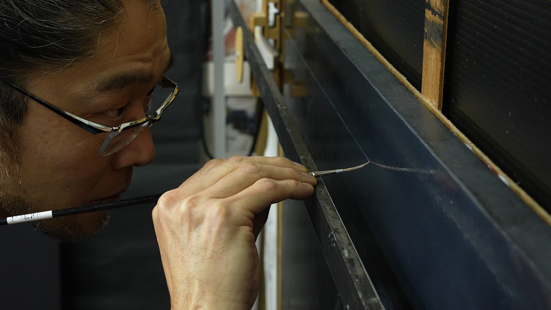 - ケガかれた溝に手描ききで油絵の具をのせることで線を描画。