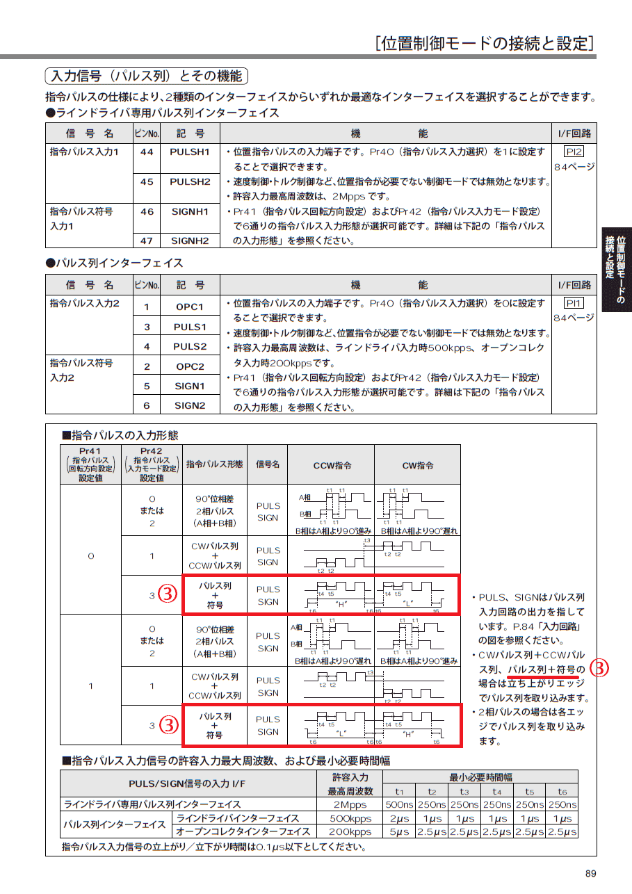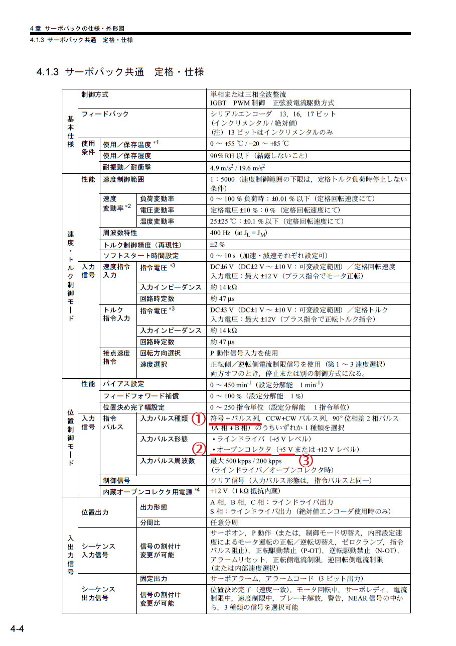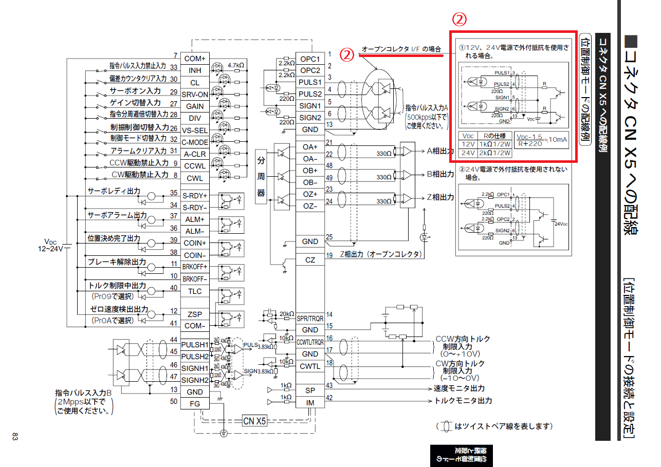 - パルス方式:1パルス方式(パルス列+符号、指令+方向など)