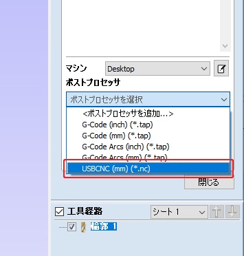ポストプロセッサにUSBCNC (mm)(*.nc)を選択できるようになります。USBCNC (mm)(*.nc)を選択している状態でNCプログラムを保存します。