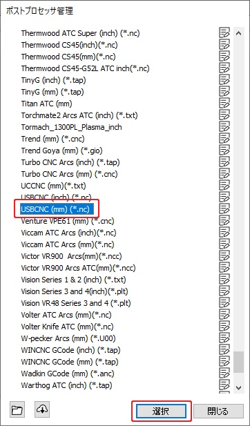 USBCNC (mm)(*.nc)を選択し、選択ボタンをクリックします。