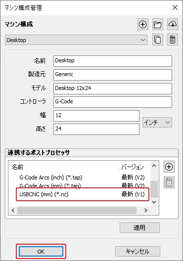 連携するポストプロセッサにUSBCNC (mm)(*.nc)が追加されているのを確認し、OKボタンをクリックします。
