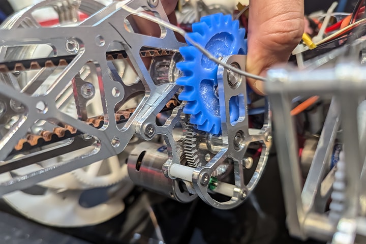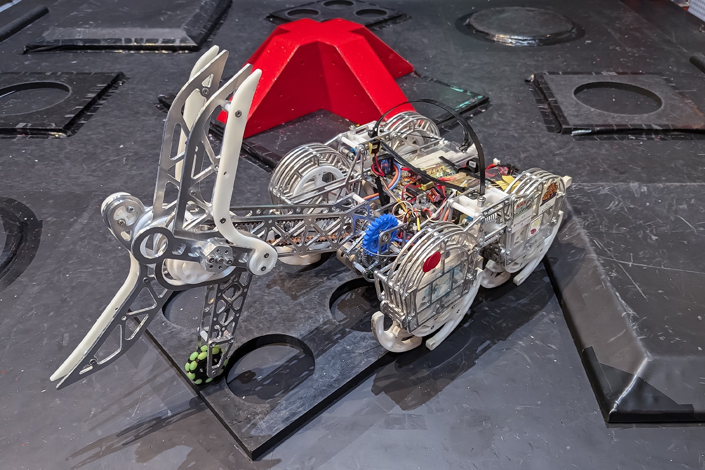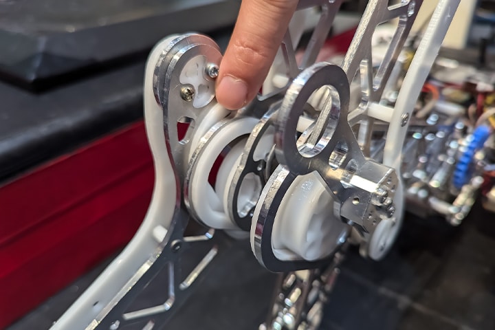 アルミの削り出しパーツを使いつつ、重量制限内に収めるのは機体設計者としての腕の見せどころです。特に、機体が大きくなるほど、強度を保ったまま軽量化していくのは至難の業です。今大会でひと際大きなアルミの削り出しパーツを使用していたのが、Yara:Makers 製作のロボット「菊 Top Road」です。ほとんどのパーツに軽量化のための肉抜きが施されており、その機体に込められた設計者の並々ならぬ努力が感じられました。