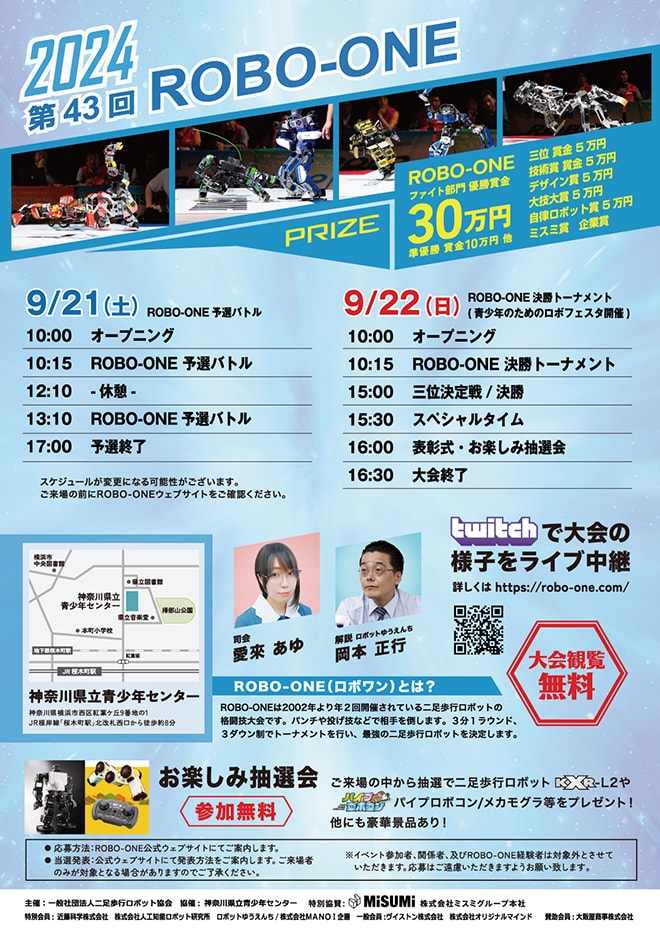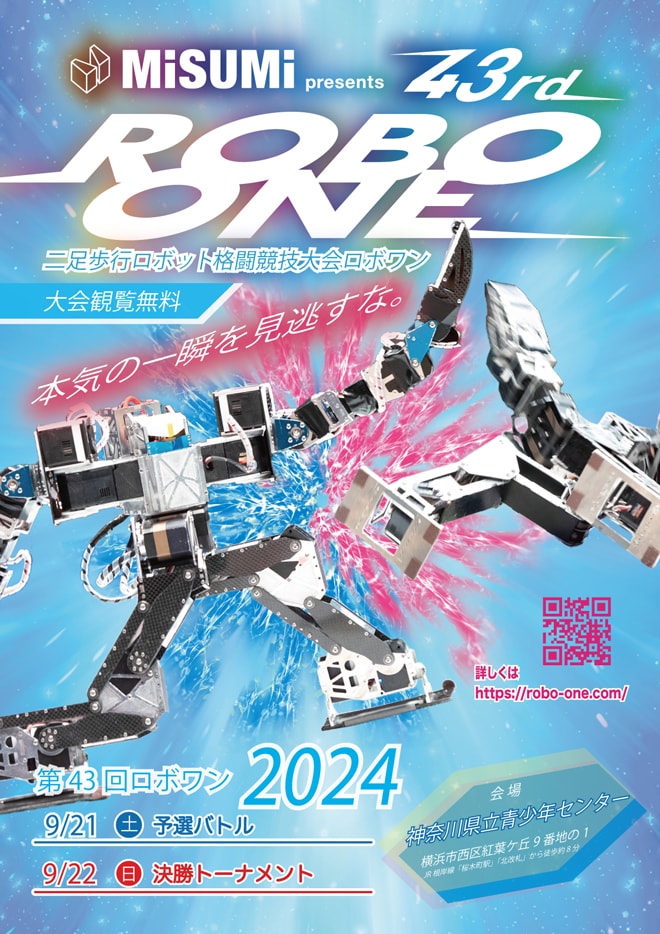 また、当社が協賛している二足歩行ロボット格闘技大会「MISUMI presents 第43回ROBO-ONE」がホールにて併催されます。当社からは企業賞として、「オリジナルマインド賞」をご用意しております。また、当社の開発スタッフも選手として出場いたします。無料で観覧いただけますので、ぜひお気軽に足をお運びください。