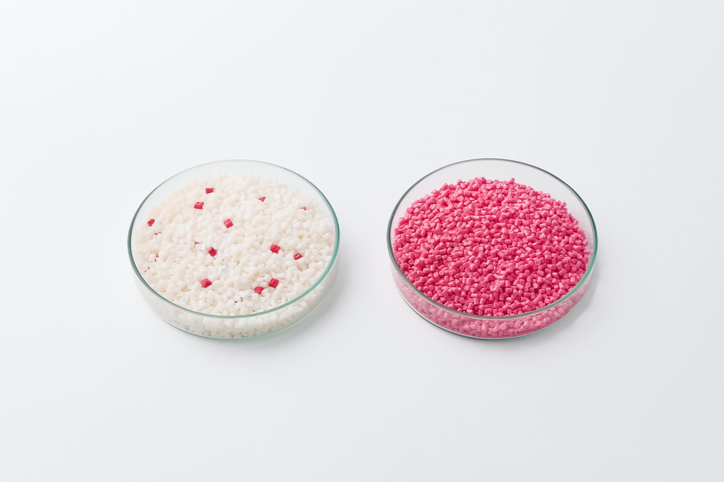 実際に、ペレタイザーを使って ABS のペレットに着色しました。画像左が混練前の ABS のペレットと赤色、白色のマスターバッチ、画像右が混練後の着色されたペレットです。色素を高濃度に含むマスターバッチと共に溶融し、混練することで、ペレット全体に着色ができます。また調色に限らず、ガラス繊維や木粉などを添加し、材料の機能性を高めることも可能です。