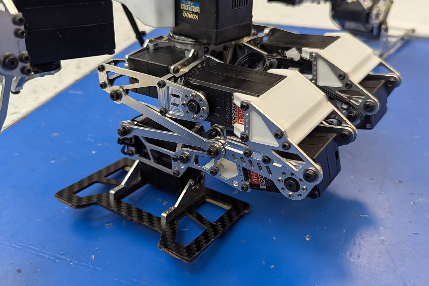 もう1つのポイントとして、肩のサーボモーターを肘側に配置することで、規格審査時には重心を上半身に、バトル時には下半身に落とす構成にし、状況に応じた重心制御を実現しています。