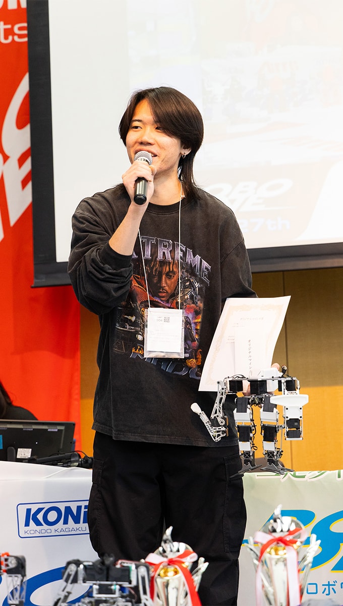 オリジナルマインド賞には、ツノさんが製作したロボット「ヘリオス」が選ばれました。決勝トーナメント1回戦で惜しくも敗退となったものの、その製作プロセスや技術的なこだわりが高く評価されました。