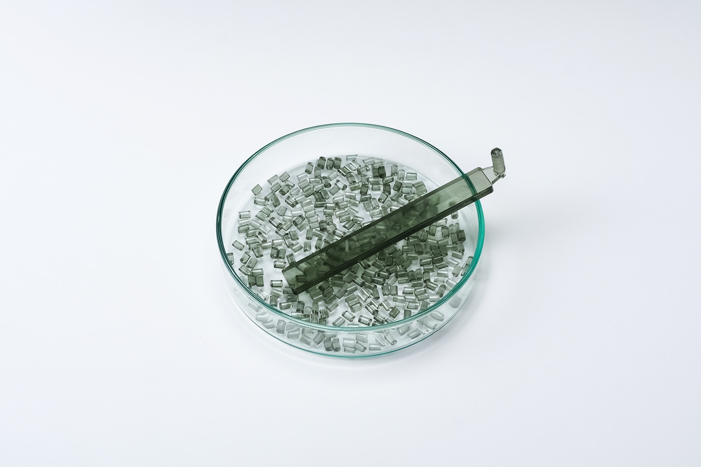 混練 1 回のサンプルを光に透かして見ると、やや色ムラがありました。一方で、一度ペレット化した材料を CONERI で再度ペレット化した混練 2 回のサンプルは、色ムラが大きく改善し、より均一な外観となりました。