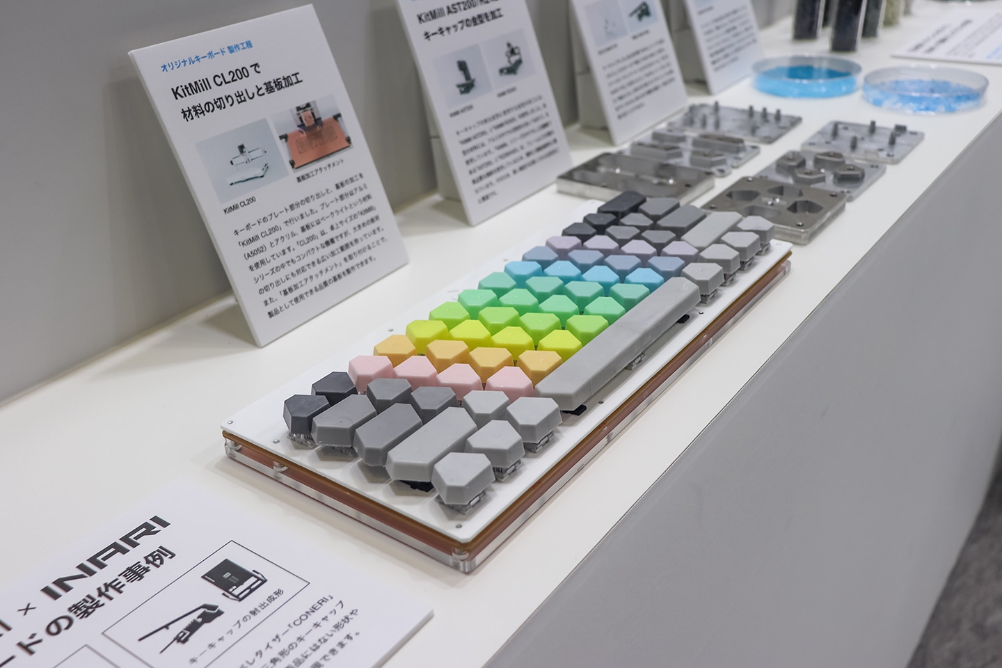 「INARI M06」による実演エリアの周りには、各製品を使って加工したサンプルを多数展示しました。実演をきっかけにサンプルへ関心を寄せるお客様も多く、説明に耳を傾けながら、加工サンプルをじっくりご覧になる方もいらっしゃいました。