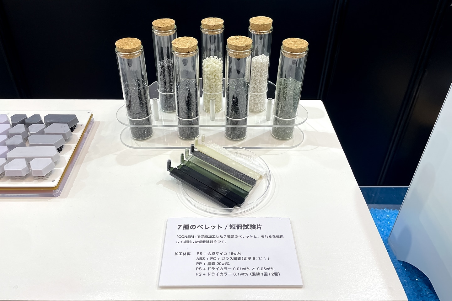 さらに、「CONERI」で混練したペレットや、オリジナルマインドの卓上工作機械を組み合わせて製作した「オリジナルキーボード」など、各種加工サンプルもあわせて展示しました。実際に機械が動くようすと、それらを用いて製作したサンプルをご覧いただくことで、初めて当社製品に触れる方にも、卓上での気軽なものづくりをイメージしていただけたのではないかと考えています。