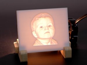 PhotoVCarveを使うと画像を元に、リトフェイン加工のツールパスを出力することができます。切削する深さでグラデーションを表現しており、裏から光を当てると透過度の違いにより読み込んだ画像(白黒)が現れます。思い出作りにいかがでしょうか。
