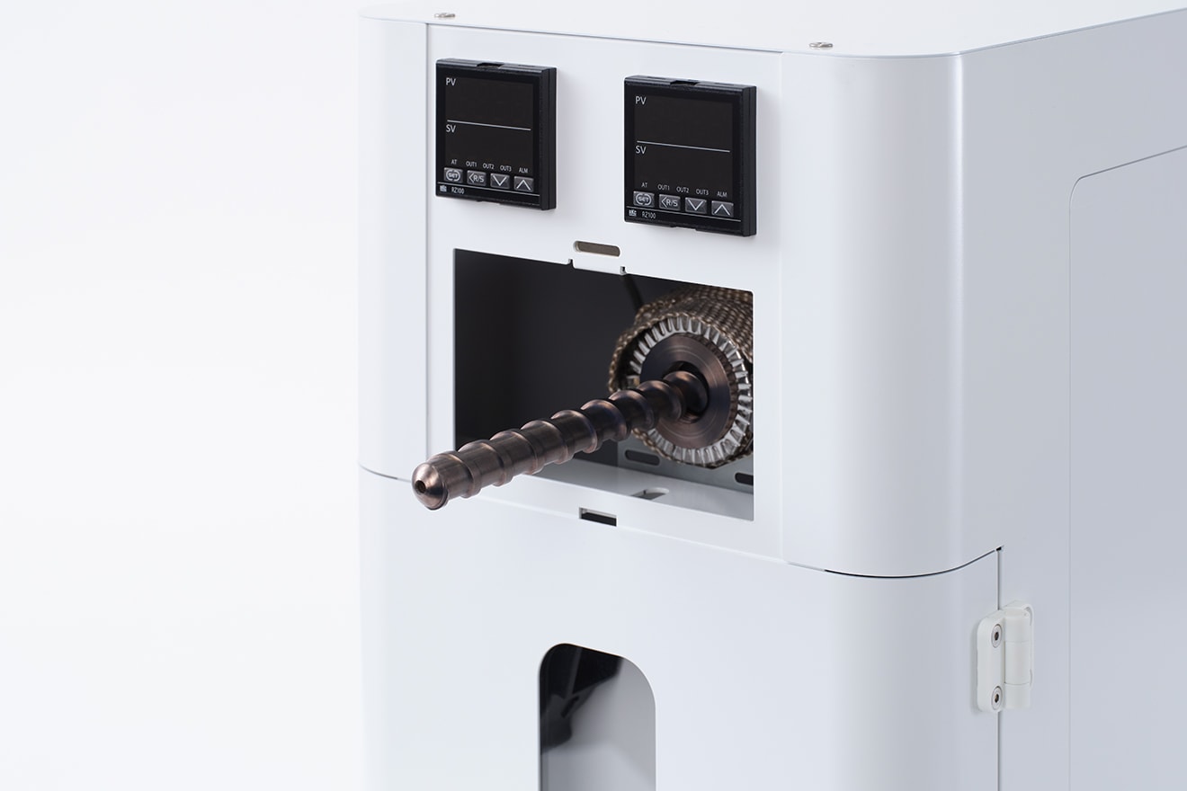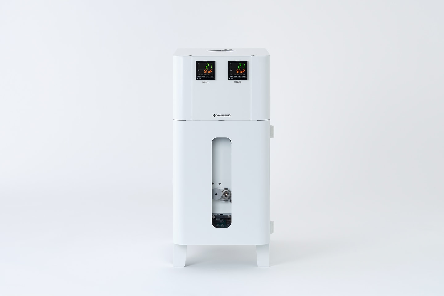 そこで「CONERI」では、樹脂を水平方向に混練したあと、真下に押し出してカットする「反転L字型」の独自構造を採用(特許出願済)。これまでの発想にとらわれない大胆なデザインによって、卓上で完結するコンパクトサイズを実現しました。自分の手元ですぐに樹脂ペレットがつくれる手軽さが、材料開発のスピードを加速させます。