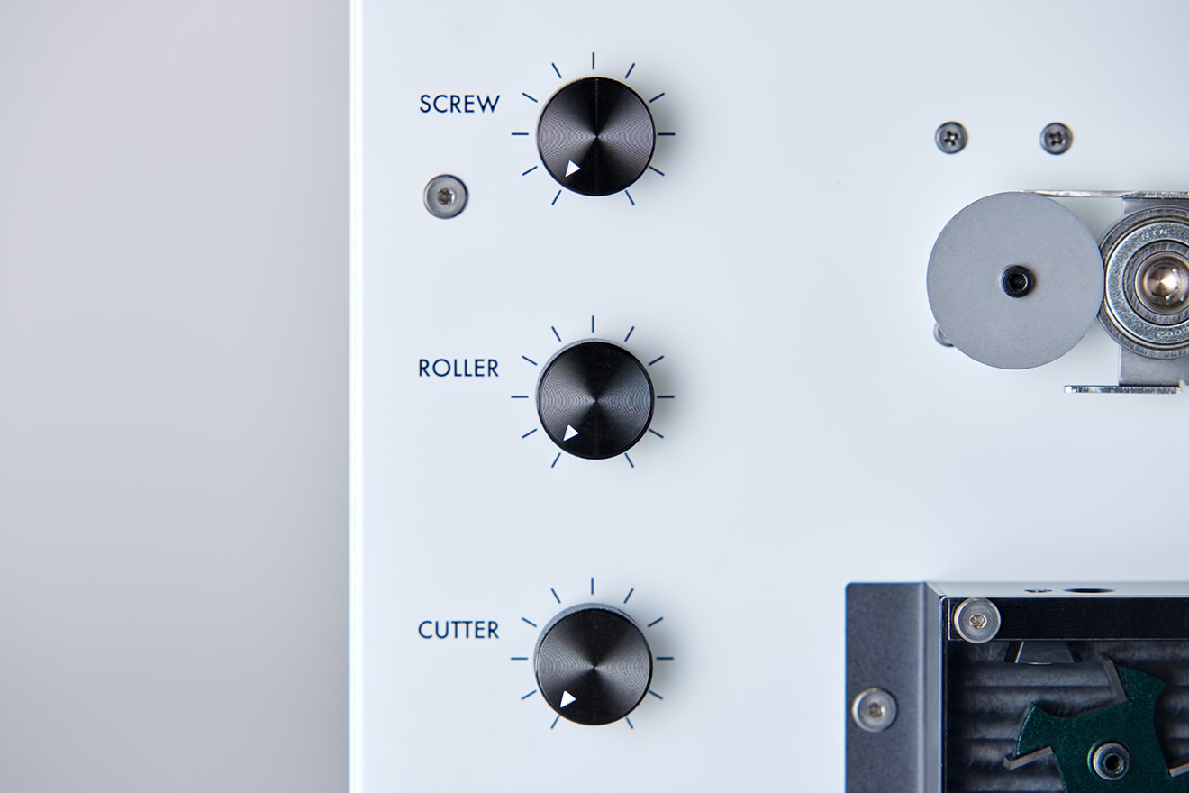 「CONERI」のインターフェースには、各機能を直感的に操作できるアナログツマミを採用。ストランドの押出速度やローラーによる引き込み速度、カッターの回転数を細かく調整することで、ペレットの径や長さを自在にコントロールできます。さらに、冷却ファンの風量やホッパーの回転数も調整可能。ペレットの仕上がりを目視で確認しながら、その場で最適な条件を追い込んでいくことができます。
