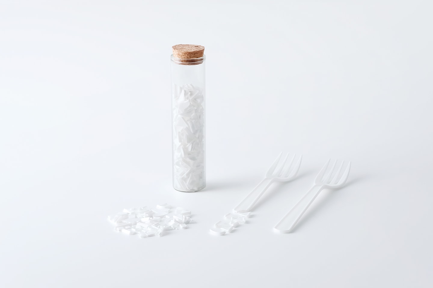 使い捨てのプラスチックフォークを破砕し、バージン材と混ぜ合わせてペレット化しました。