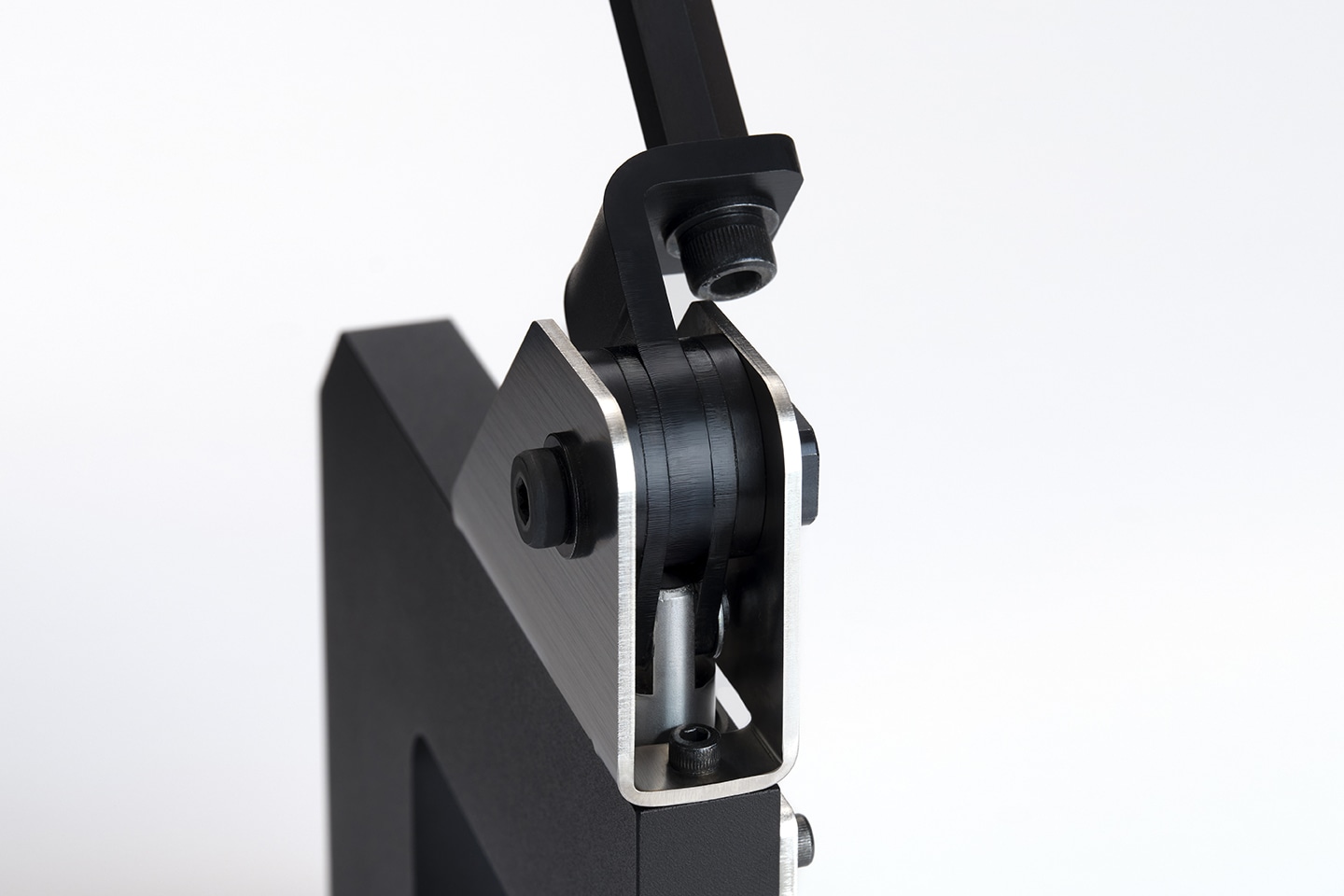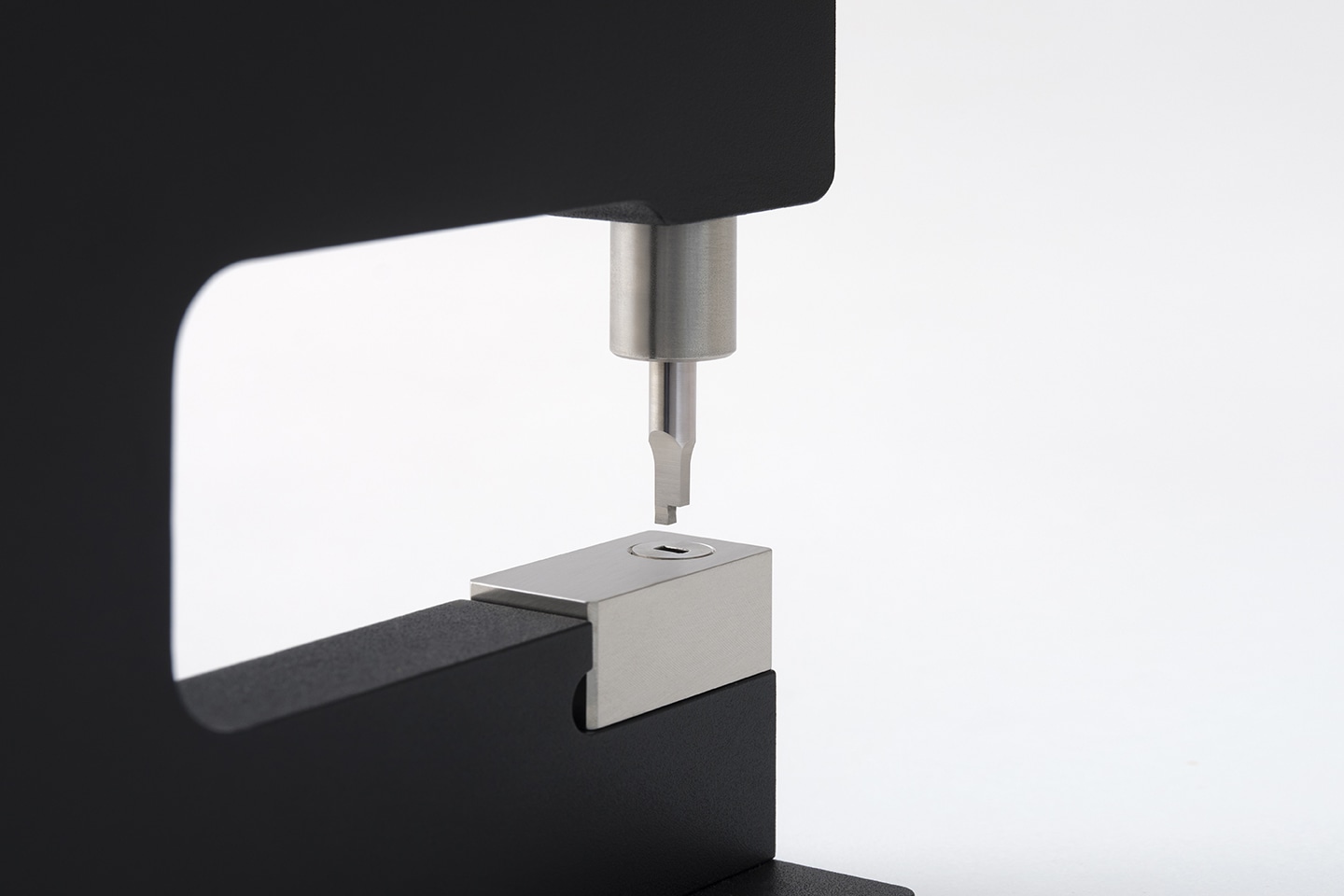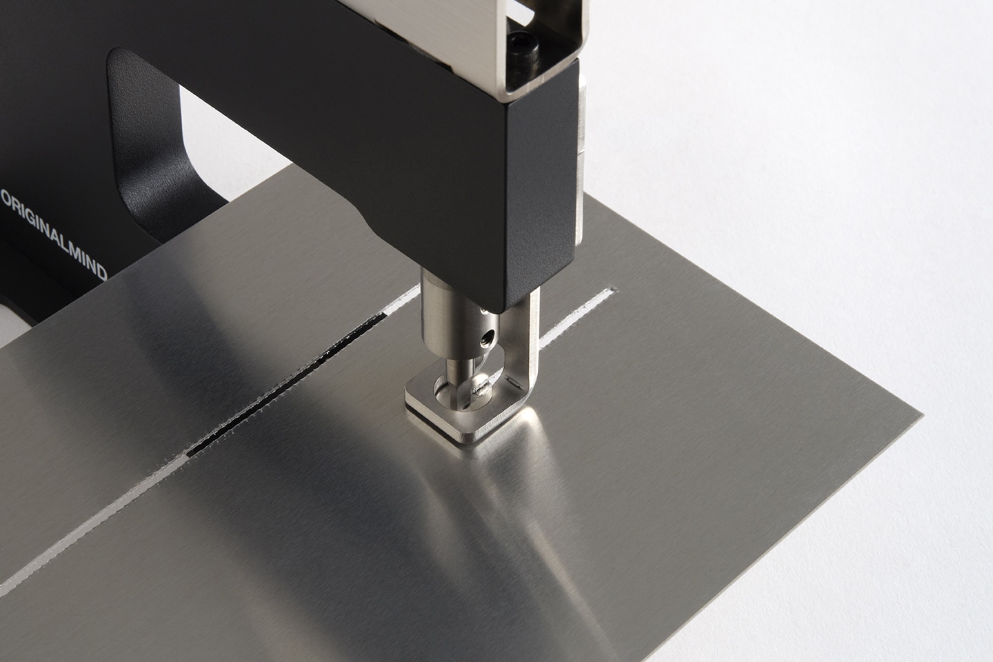 わずかな力で大きな力を生むトグルリンク機構の採用により、軽い操作で板金の抜き加工が可能です。さらに、前機種からハンドルの角度と長さを見直すことで、卓上作業でも快適な操作感を実現しました。1mm 厚のアルミ板を抜く際に必要な力は約 3.5kg 程度で、作業時の負担を抑え、心地よく加工を続けることができます。