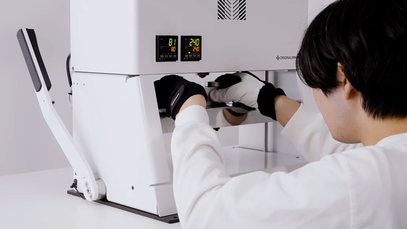 「INARI P35」の操作は極めて簡単です。材料を投入し、型をセットしたらハンドルを手前に倒して、ボタンを押すだけ。複雑な操作を必要とせず、誰でも安定して高品質な成形が可能です。