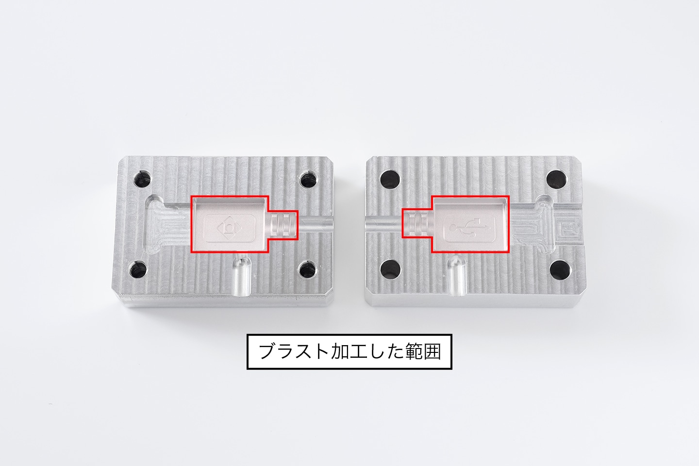 ブラスト加工してない場合は成形品にツールマークがハッキリと転写されますが、ブラスト加工してあるため成形品の表面はなめらかです。