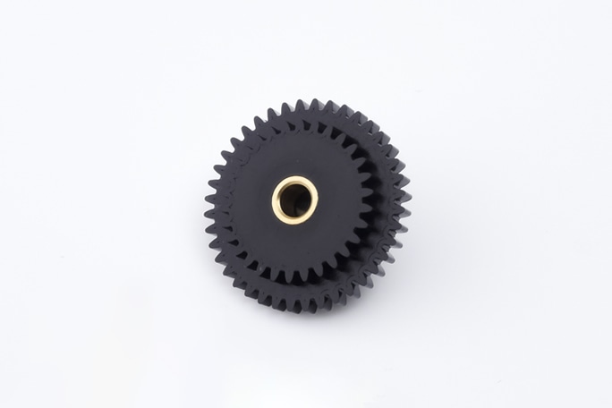 歯の部分はPOMのためすべり特性があり、軸穴は金属のため強度があります。金属部品から置き換えれば軽量化の効果もあります。