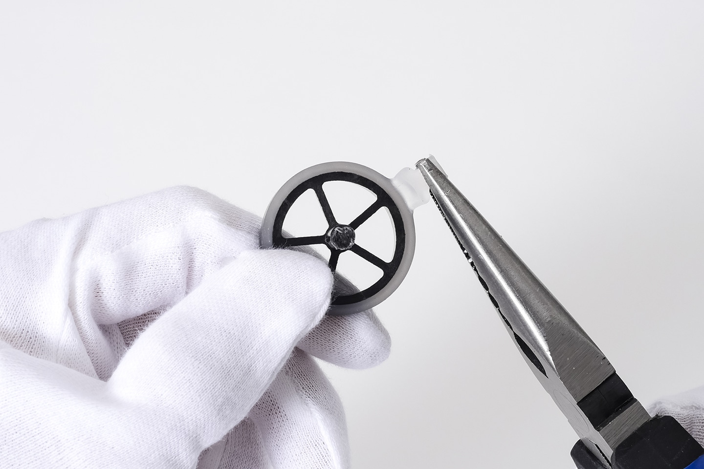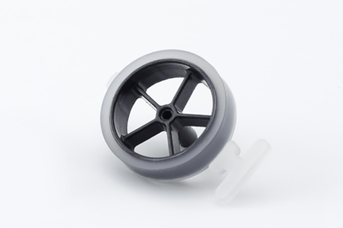 2色成形の例として、ホイールの周りにTPEを溶着させたタイヤの成形手順をご紹介します。接着剤等を使わずに一体化した部品を製作できます。