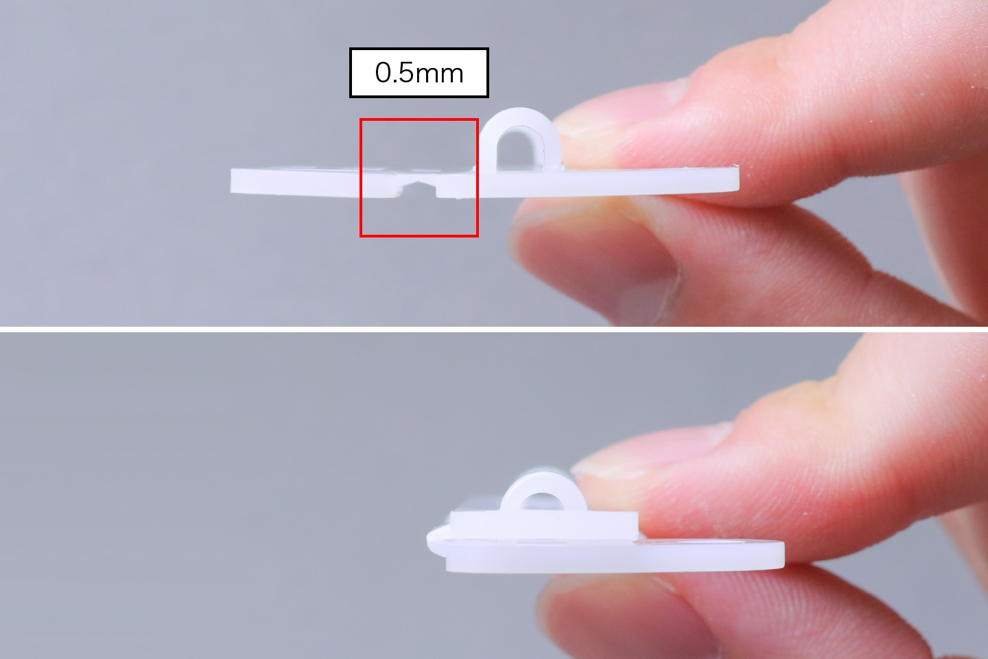 ヒンジ部分の最薄部は0.5mm厚で製作しました。ヒンジを谷型に設計することで、最薄部分で折れ曲がるように設計することができます。