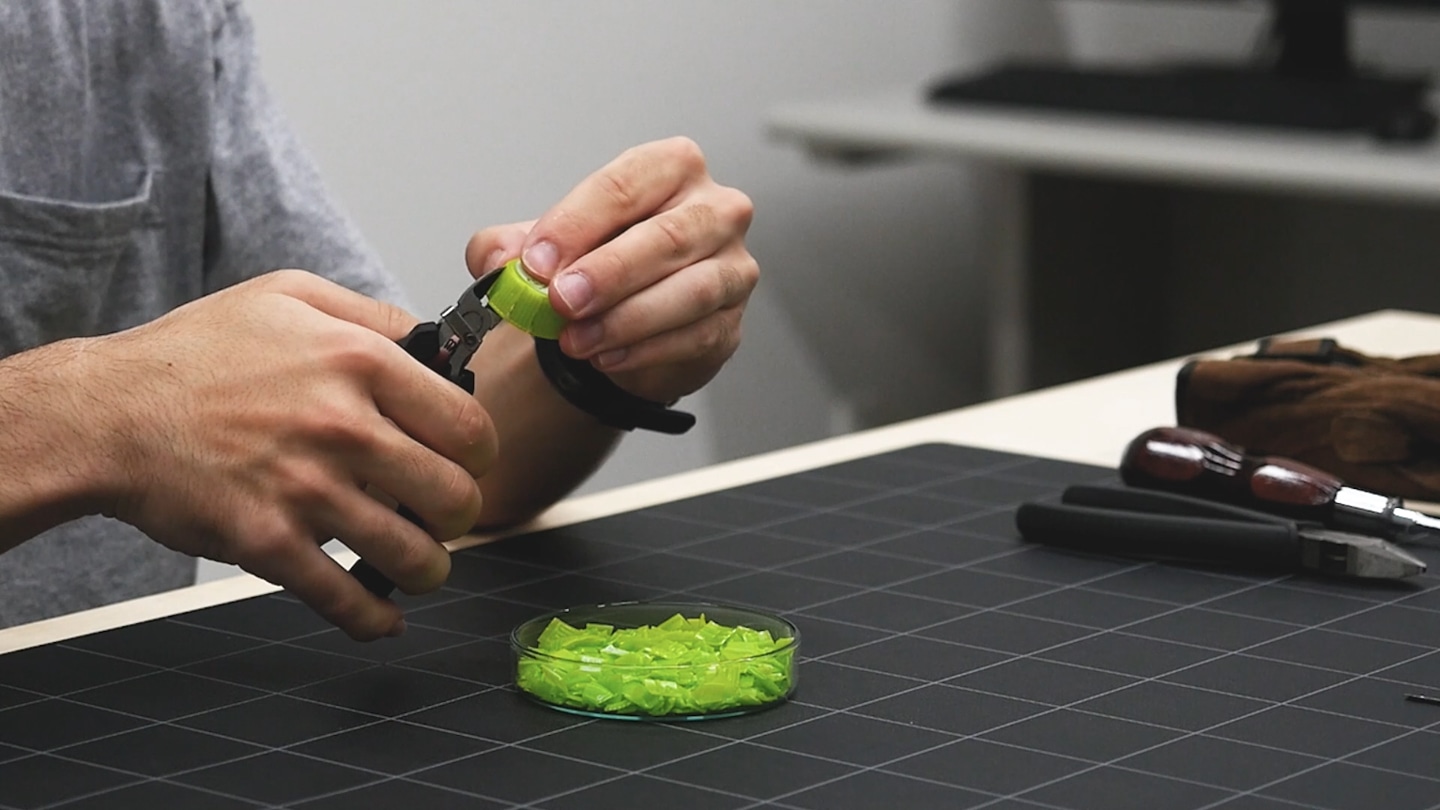 手動射出成形機「INARI」なら、プラスチックの端材をリサイクルして成形することができます。今回は、ペットボトルキャップをニッパーで細かく裁断し、材料として使用しました。ペットボトルキャップの色合いを活かした、カラフルな成形品がつくれます。
