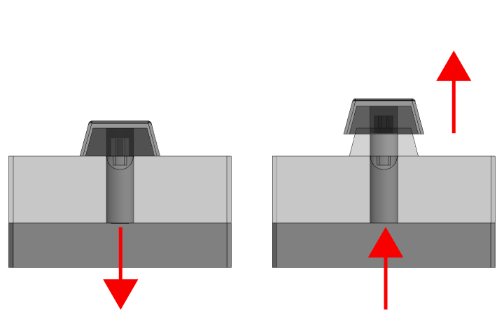 成形後、コア(オス型)から入れ子を取り外し、押出プレートを差し込むことで成形品を取り外します。