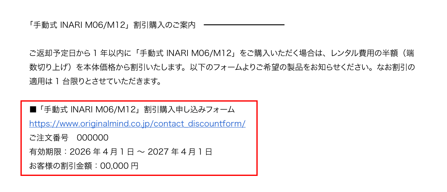 試用セットレンタルサービスをご利用後に「手動式 INARI M06/M12」をご購入いただく際には、1台につき試用レンタル費用の半額(端数切り上げ)を割引いたします。複数台を同時にご購入の場合も、1台ごとに割引が適用されます。ただし、割引の適用は1回のご注文限りとなります。