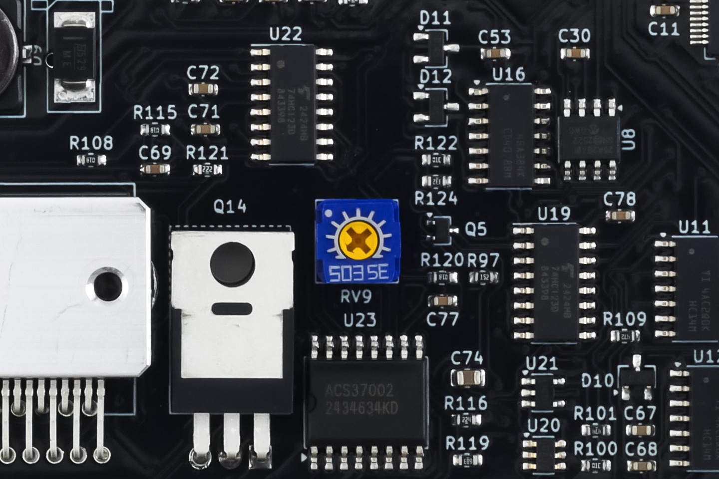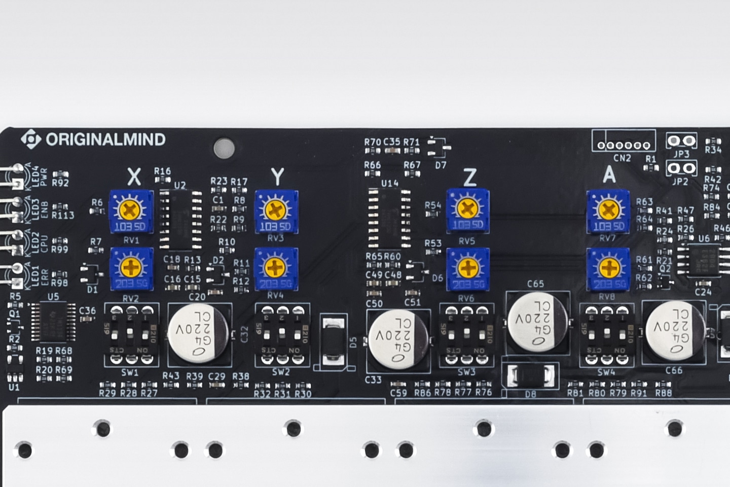 各軸に対応したボリュームを調整することで、ステッピングモーターの駆動時のドライブ電流と、回転停止時のホールド電流を設定することができます。上側のボリュームがドライブ電流、下側のボリュームがホールド電流です。ボリュームの目盛り 1~11 で、左に回すと小さく、右に回すと大きい値に設定できます。