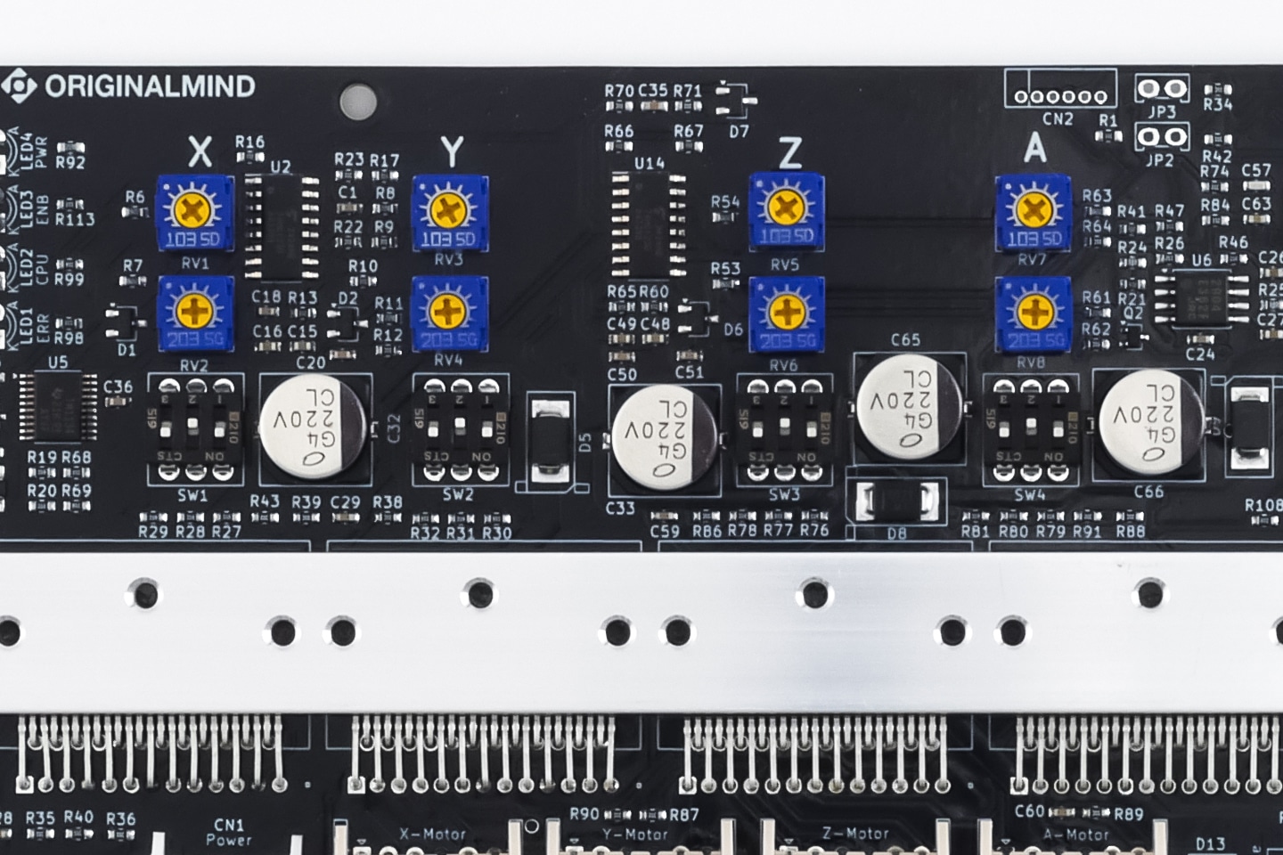 各軸に対応した DIPスイッチを設定することで、ステッピングモーターを駆動させる際のマイクロステップの設定ができます。スイッチの ON/OFF は、マイナスドライバーなどを使って行います。