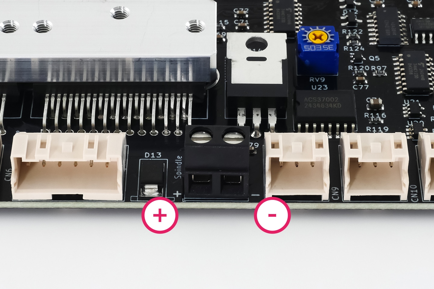 コネクタのピン番号は、上図の左から 1、2 です。各端子にスピンドルモーターの配線(2本)を接続します。配線を入れ替えることで、スピンドルモーターの回転方向を変更できます。リレーを接続する場合は、定格 DC24V のものを使用してください。スピンドルの回転数指令を使用する場合は、拡張端子出力 の PWM(3.3V、5Hz)または PWM-V(0~10V)を使用します。