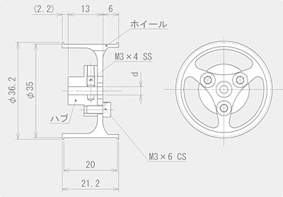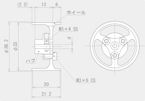タイヤ/ホイール モデル選択 ホイール+ハブセットについて ホイールとΦ3、Φ4、Φ6いずれかのハブをセットにいたしました。 キャップスクリュー・セットスクリューも付属しています。 寸法図(画像をクリックすると拡大します)