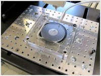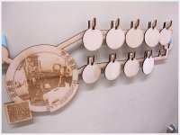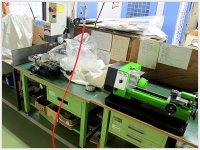 そして中には見覚えのある機械...バキュームのテーブル・ポンプ装置を見せていただいた。やはり、とても丁寧に作られている。バキュームによる固定は切削負荷が大きいと使えないそうだが、表面をさらう程度のキーホルダーの製作であれば、十分使用できるそうだ。材料の取り外しが頻繁にある切削では、両面テープでの固定に比べ、重宝するのではないだろうか。JIMTOFではこちらの装置を使い、訪問者の方向けにキーホルダーを製作されていた。