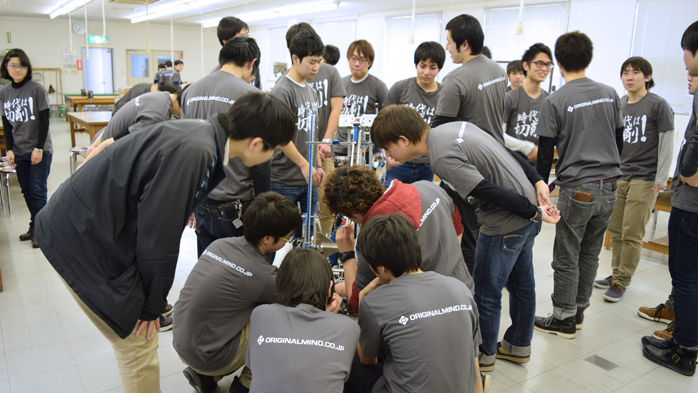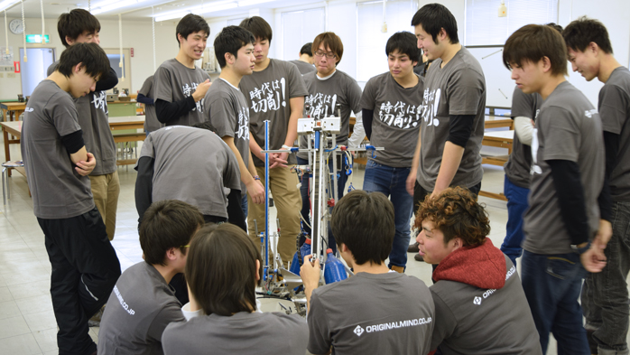 集合写真の撮影が終わると、学生たちはすぐさまロボットの周囲に集まり「この機構はこうだ」とか「この部分をこうしたらもっと良くなるのでは」など、ロボット談義を始めた。学生たちのロボットへの強い関心と熱意が感じられた場面であった。