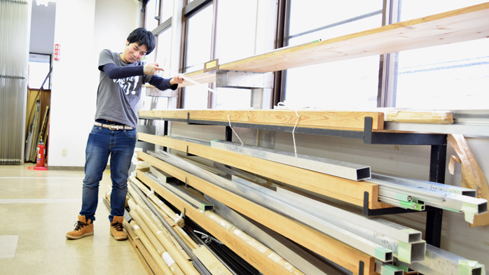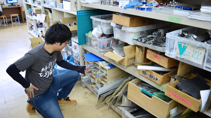 様々な試作部品や材料が置かれている。学生たちはここから自由に使いたいアルミ角材などの材料を持って行ける。所々にプロジェクトの名前が書かれているのが目についた。こうして名前を書いておかないと、いつの間にか誰かに持って行かれてしまうらしい(笑)