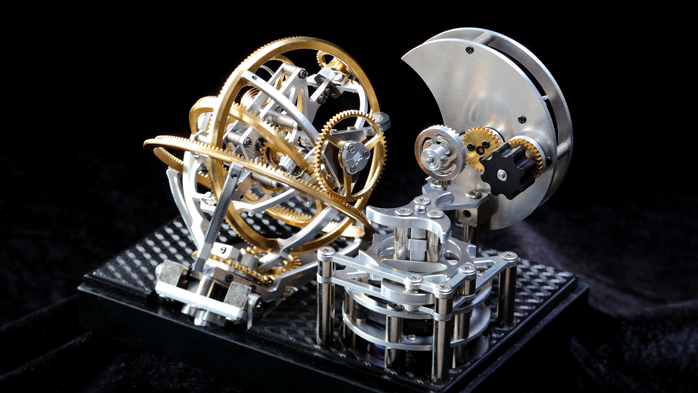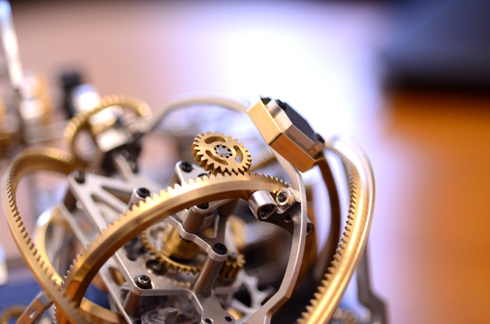 この作品にも使われている三次元の調速機構は、見た目の美しさもさることながら、機能としての意味もある。あらゆる角度で軸が通っているので「重力」の影響を平均化してくれるのだ。腕時計や懐中時計のようにあらゆる方向から重力が掛かる機構には、その些細な力でも積み重なってしまい時計を狂わしてしまったりなどのトラブルに繋がってしまうのだ。ただ美しいだけではなく、その形に「機能」が備わっていることがまたその魅力を大きなものにしてくれている。