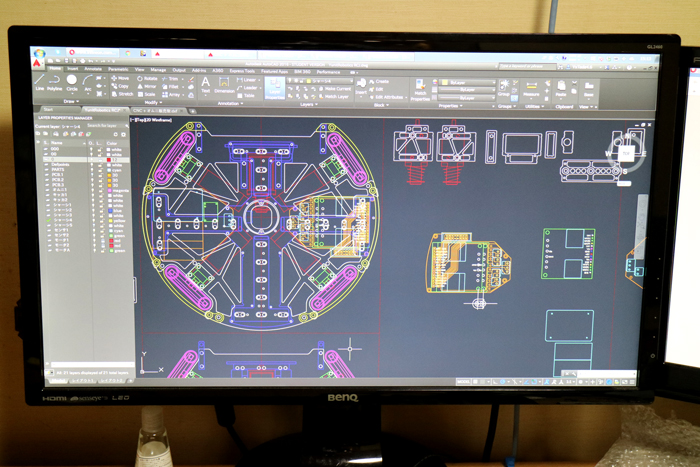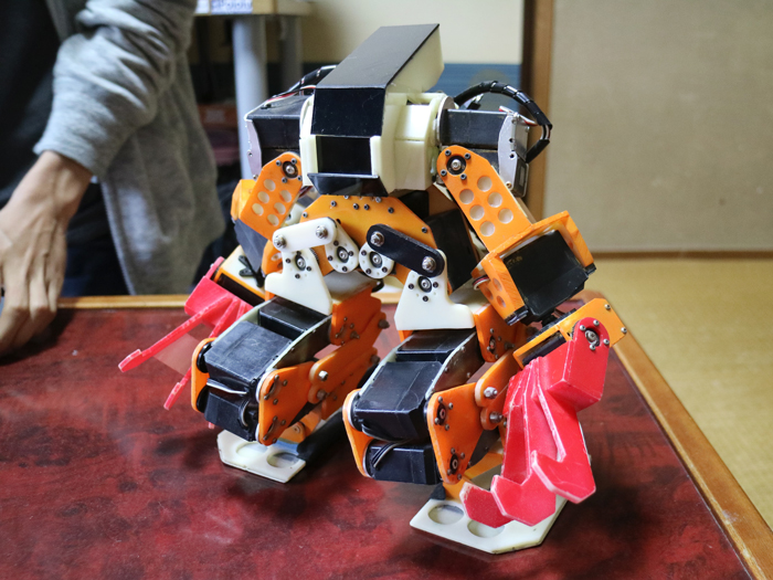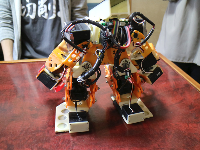 この二足歩行ロボットは、そのときに彼が作ったものだが、使われているサーボは、そのロボットサークルの先輩たちに古いサーボを譲ってもらったものだそうだ。しかし貰ったサーボはトルクが弱く、そのままでは満足に二足歩行ができなかったため、彼は1関節に2個のサーボを使い、同期させてトルクアップを図っている。1関節に2個のサーボというのは、制御的にもメカ的にも作るのが大変だったと思うが、逆にそのことが彼をレベルアップさせたようだ。