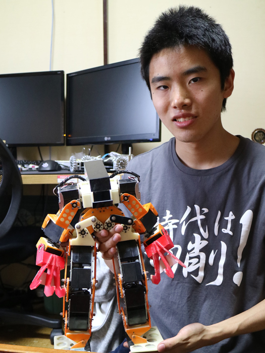 多田さんは現在高専2年生。ロボカップジュニアに初参加で日本大会に準優勝し、世界大会では18ヶ国中5位という素晴らしい成績をおさめた大変優秀な若者である。驚くのはそれだけではない。彼はなんと中学生の時には既に二足歩行ロボットを製作していたのだ。近年は個人でも高度なものづくりができる環境を手に入れやすく、そのハードルはかなり下がってきた。だがしかし、中学生という若さで二足歩行ロボットを完成させる人はそう多くいるものではない。そのためか、彼には共にロボットづくりを楽しみ、高め合うことのできる仲間が周りにはいなかったという。このためお母さんの応援も借りながら、社会人が運営するロボットサークルに入り、ロボット作りを続けたそうだ。