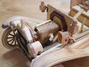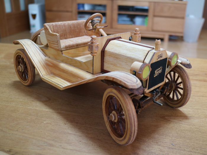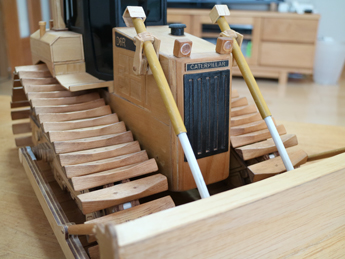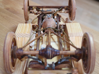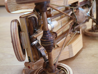 これは、Paradiseさんのいちばんのお気に入りの作品「木製T型フォード」。以前自動車の整備士をしていたそうで、もし自動車の模型をつくるなら、世界で最初に量産された「T型フォード」と決めていたという。だが、これも設計図があるわけではないので、ネットから膨大な数の写真や資料を集めて寸法を割り出したそうだ。作品を見るとわかるが車体の裏側の構造部分まで細部にわたって見事に再現されており、とても設計図なしでつくったとは思えないほど高い完成度であった。さらに車体の裏側を見てほしい。リーフスプリングがあるのがわかるだろうか。これはなんと掃除機の中の電源コードを巻き取るバネを活用したのだそうだ。動画の通り、この車体を下方向に押してみると、ちゃんとクッションとして機能していることがわかる。さらに、ボンネットをあければエンジンが搭載されていたり、ハンドルを回せばちゃんとタイヤが動くようになっていたりと実にリアルだ。そのうえとても美しいからいつまでも見入ってしまう。設計図も既成パーツもないところからここまでこだわり抜いて作品をつくる人はなかなかいないだろう。