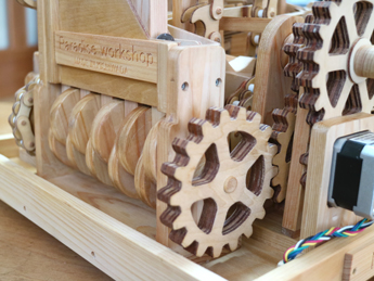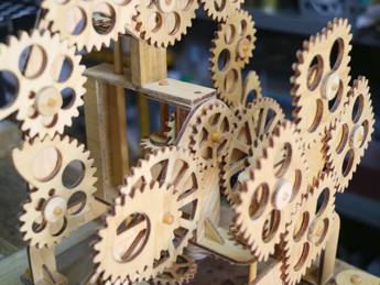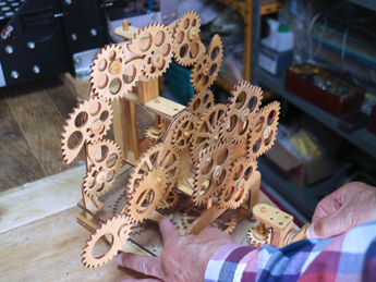 ほかにもいろいろと見せていただいたのだが、Paradiseさんの作品の特長は、機構そのものはメカメカしいものであっても、素材に木を使っているため温かみが感じられるところだ。どれも動くようになっているが美しいので置物としても魅力がある。ちなみにParadiseさんは、左上の写真のテオヤンセン機構を用いたロボットのCADデータをご自身のWEBサイトで公開されていらっしゃるので、参考にしたい方はご覧になってみてはいかがだろうか。左下と右下の写真は非円形の歯車が回転するおもちゃ。ハンドルを回すとすべての歯車が一斉に回転しだすので見ていて面白い。ちなみにParadiseさんの使っている歯車製作のソフトは、Woodgears.ca(ウッドギアーズ・カナダ)のGear template generator($26)だそうだ。
