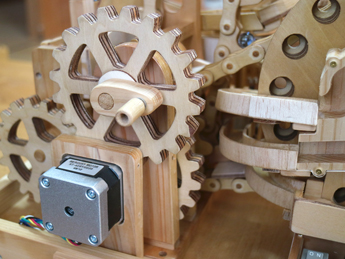 これはマーブルマシン。このコンパクトなトレイの中に5つものマシンが組み込まれており、たった一つの動力でその5つのマシンすべてが連動するようになっている。実際に動くところを見せてもらったのだが、ビー玉がいろいろなアトラクションに乗っているような感じが面白くてずっと見入ってしまった。ビー玉がどこかに飛んで行ったり引っ掛かったりすることもなく安定して動き、しかも、どこにも渋滞することなく均等に動いていた。YouTubeにはマーブルマシンの動画はたくさんあるが、これほど完成度の高いものはなかなか少ないのではないだろうか。ちなみに、このマシンを駆動しているのは42ミリ角のステッピングモーターだった。これほどたくさんの機構を動かしているのに、こんなに小さなモーターひとつで動いているということは、無理なくスムーズに動く設計と調整がされているのだと私は思った。