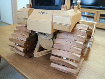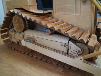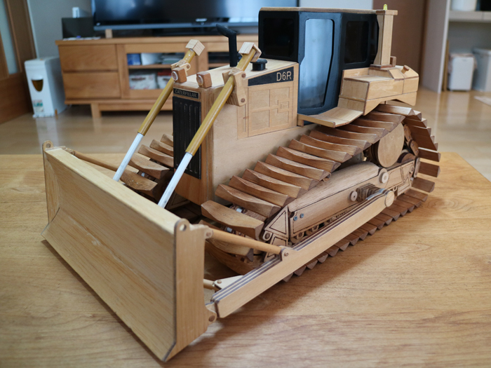 ご自宅に伺ってまず最初に見せていただいたのが、ものづくり文化展2013の最優秀賞受賞作品である「木製ブルドーサー」。この作品のモデルとなったのは、Paradiseさんが以前大阪湾の埋め立て地で検査の仕事をしていたとき、近くの工事現場で動いていたというキャタピラー社のD6R3-LGP型湿地用ブルドーザーだ。日本のブルドーザーとは違ってすごく迫力があり、その力強さに魅せられたのがつくろうと思ったきっかけだそうだ。しかし、つくると言っても設計図があるわけではない。だからその時の記憶とネットからの資料を手掛かりに寸法を割り出したのだそうだ。作品を見ると、そうとは思えないほど綿密に再現されていた。しかも、単なる置物ではなくモーターが内蔵されており、リモコンで自在に動くようになっている。さらにすごいのは、無限軌道(クローラー)の履板(シュー)が、平板ではなく立体形状になっていることだ。Paradiseさんはこれを自作のCNCで3次元加工をしてつくった。その数なんと84枚。数が多いからCNCがとても役に立ったという。